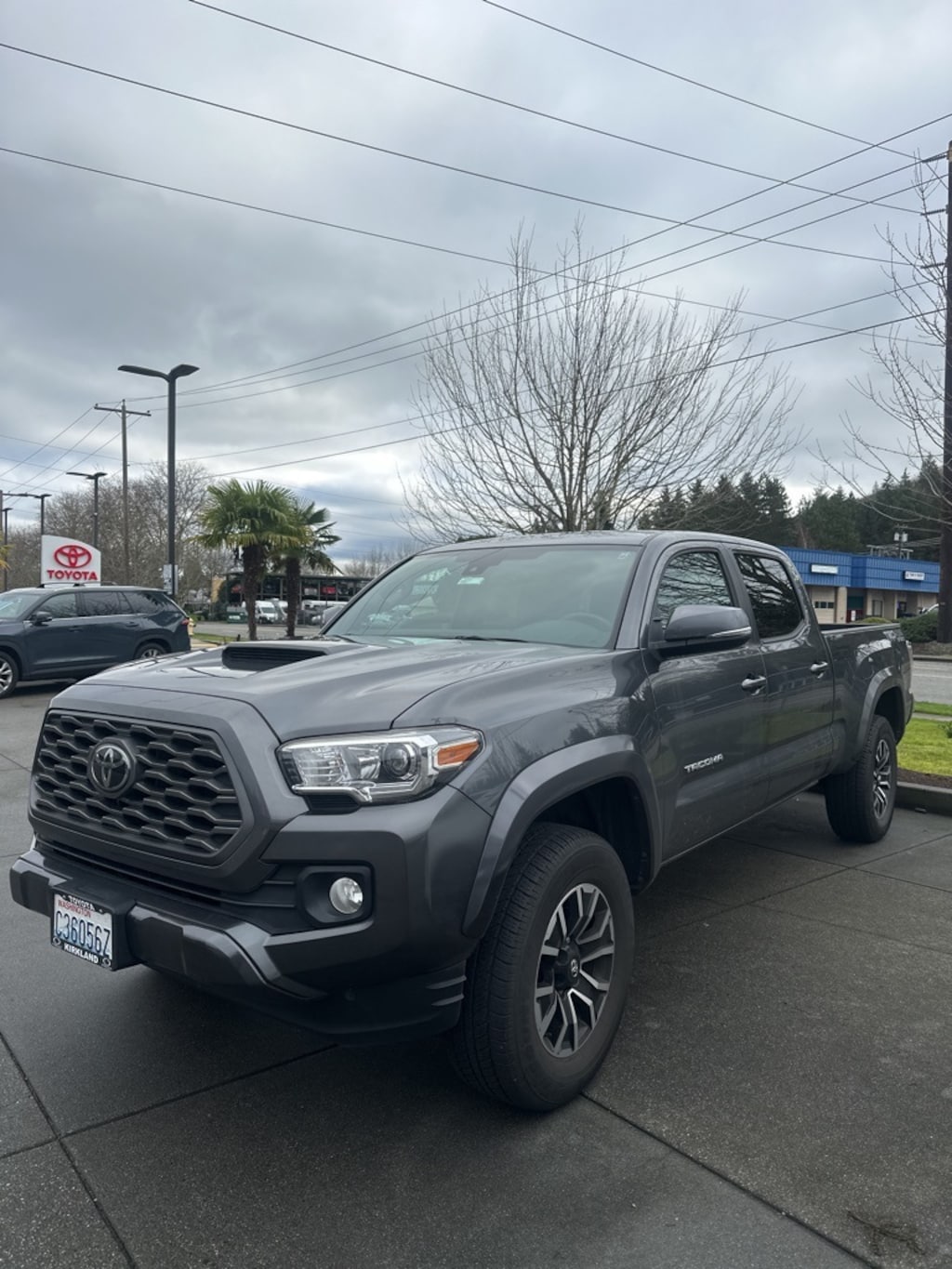 Toyota Gold Certified Certified, 4WD, 120V/400W Deck Mounted AC Power, 6 Speakers, ABS brakes, Air Conditioning, Alloy wheels, AM/FM radio: SiriusXM, Anti-whiplash front head restraints, Apple CarPlay/Android Auto, Auto High-beam Headlights, Auto-dimming Rear-View mirror, Auto-Dimming Rearview Mirror w/HomeLink, Automatic temperature control, Axle Ratio: 3.91, Brake assist, Bumpers: body-color, Color-Keyed Rear Bumper, Driver door bin, Dual front impact airbags, Dual front side impact airbags, Electronic Stability Control, Emergency communication system: Safety Connect with 1-year trial, Engine Immobilizer, Exterior Parking Camera Rear, Fabric Seat Trim (FD), Front anti-roll bar, Front Bucket Seats, Front Center Armrest, Front dual zone A/C, Front fog lights, Front reading lights, Front Seats, Front wheel independent suspension, Heated door mirrors, Illuminated entry, Knee airbag, Leather Seat Trim, Leather Shift Knob, Low tire pressure warning, Occupant sensing airbag, Outside temperature display, Overhead airbag, Overhead console, Panic alarm, Passenger door bin, Power door mirrors, Power driver seat, Power steering, Power windows, Radio: AM/FM Radio, Rear step bumper, Remote keyless entry, Security system, Smart Key w/Push Button Start, Speed control, Speed-sensing steering, Split folding rear seat, Steering wheel mounted audio controls, Tachometer, Telescoping steering wheel, Tilt steering wheel, Traction control, Trip computer, Turn signal indicator mirrors, Variably intermittent wipers, Wheels: 17" x 7.5J Machined Alloy, 4WD. Features: 2022 Toyota Tacoma TRD Sport V6 Magnetic Gray 4WD 3.5L V6 PDI DOHC 24V LEV3-ULEV70 278hp 6-Speed Automatic