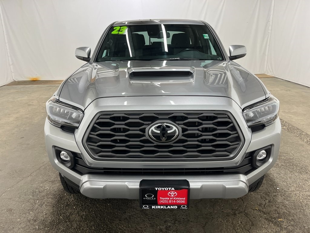 Toyota Gold Certified Certified, 4WD, 120V/400W Deck Mounted AC Power, 17" Machined Alloy Wheels, 6 Speakers, ABS brakes, Air Conditioning, All Weather Floor Liner & Door Sill Protector (TMS), Alloy wheels, AM/FM radio: SiriusXM, Anti-whiplash front head restraints, Apple CarPlay/Android Auto, Auto High-beam Headlights, Auto-dimming Rear-View mirror, Automatic temperature control, Axle Ratio: 3.91, Bed Light (TMS), Black Out Package (TMS), Brake assist, Bumpers: body-color, Color-Keyed Rear Bumper, Driver door bin, Dual front impact airbags, Dual front side impact airbags, Electronic Stability Control, Emergency communication system: Safety Connect (1-year trial), Engine Immobilizer, Exterior Parking Camera Rear, Fabric Seat Trim, Front anti-roll bar, Front Bucket Seats, Front Center Armrest, Front dual zone A/C, Front fog lights, Front reading lights, Front Seats, Front wheel independent suspension, Heated door mirrors, Illuminated entry, Knee airbag, Leather Seat Trim, Leather Shift Knob, LED Headlights w/Black Bezel LED Fog Lights, Low tire pressure warning, Occupant sensing airbag, Outside temperature display, Overhead airbag, Overhead console, Panic alarm, Passenger door bin, Power Color Turn Mirror, Power door mirrors, Power driver seat, Power steering, Power windows, Radio: Audio, Radio: Premium JBL Audio w/Dynamic Navigation, Rear step bumper, Remote keyless entry, Security system, Speed control, Speed-sensing steering, Split folding rear seat, Steering wheel mounted audio controls, Tachometer, Telescoping steering wheel, Tilt steering wheel, Traction control, TRD Sport Package, Trip computer, Turn signal indicator mirrors, Variably intermittent wipers, 4WD. Features: 2023 Toyota Tacoma TRD Sport V6 Celestial Silver 4WD 3.5L V6 6-Speed Automatic